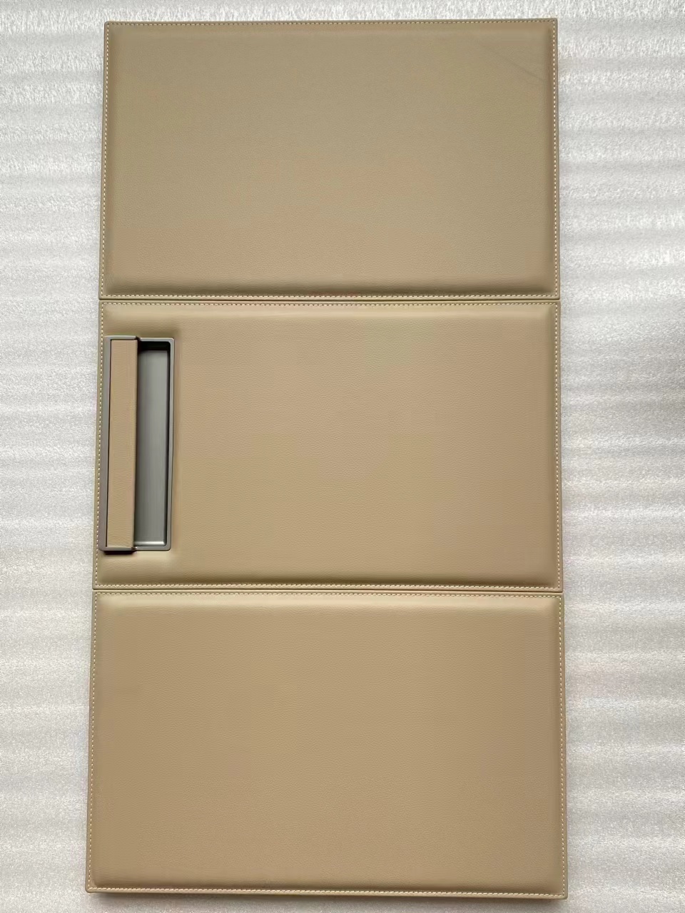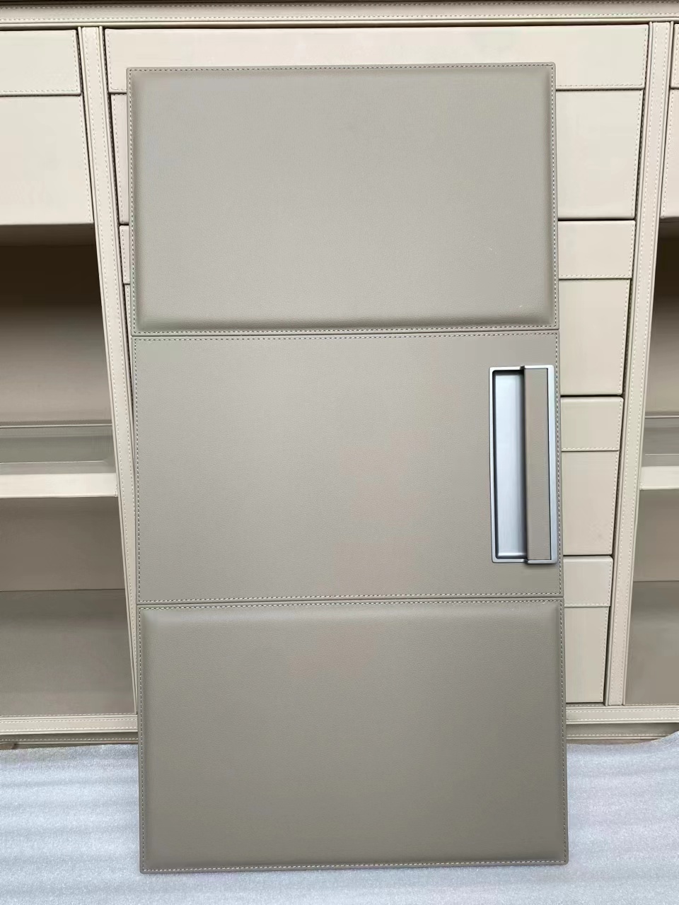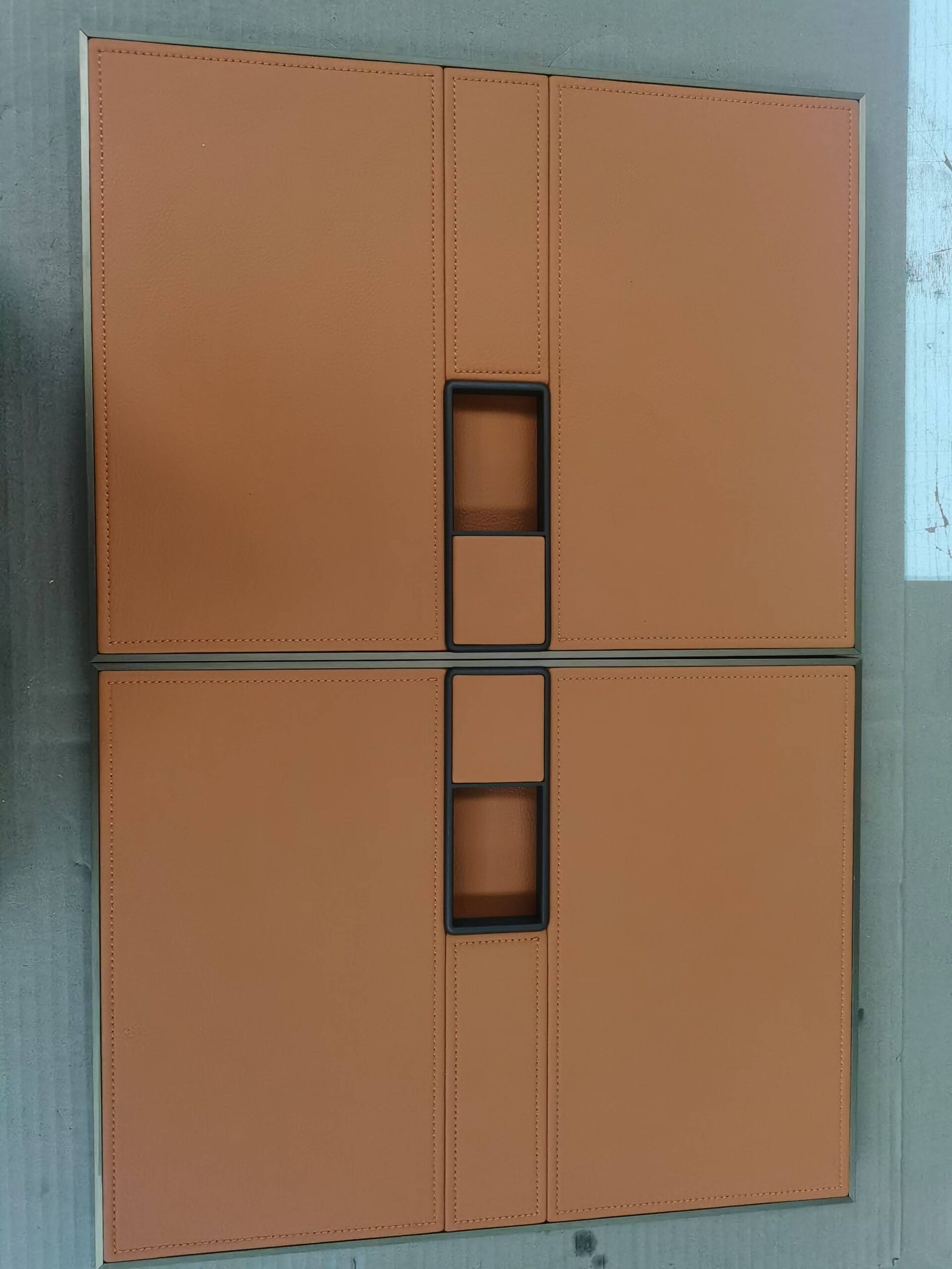 We use Continental man make leather to laminate on plywood panel. With exquisite stitching craftsmanship.